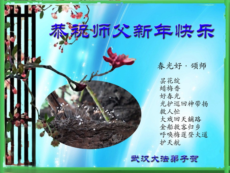 春光好•颂师 昙花绽 腊梅香 好春光 光护巡回神带扬 救人忙 大戏回天铺路 金船救客归乡 呼唤梅莲登大道 护天航 武汉大法弟子敬上 武汉市汉阳区全体大法向尊敬的师父拜年!