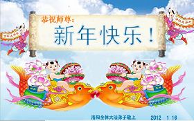 武汉市青山区全体大法弟子恭祝慈悲伟大的师尊新年好! 拜师恩 师父辛苦徒泪涟 每逢佳节深思念 蒙蒙好似师影现 示意师徒快相见 精進做好三件事 救度众生为前言 完成誓愿迎师尊 个个金刚现威严 万徒跪拜心诚孝 恭祝恩师新年好 武汉市青山区全体大法徒 2012年1月 河南沈丘县一家庭资料点弟子向师尊拜年