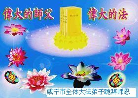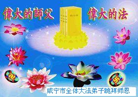 师父:您好!师父正法辛苦了!对慈悲伟大师父的浩荡恩德,咸宁市全体大法徒感激不尽,唯有在您的大法中精進,做好“学法、发正念、讲真相”这三件事,走出自己的路,正悟出自己的法,圆满了自己的世界,成就了自己的家院,走完了您安排的正法修炼路,才是对师父的真正感恩。我们所有的学法小组、炼功点的全体大法徒会努力的。咸宁市全体大法弟子跪拜师恩! 湖北省咸宁市全家大法弟子向慈悲伟大的师父拜年!恭祝师父新年快乐!