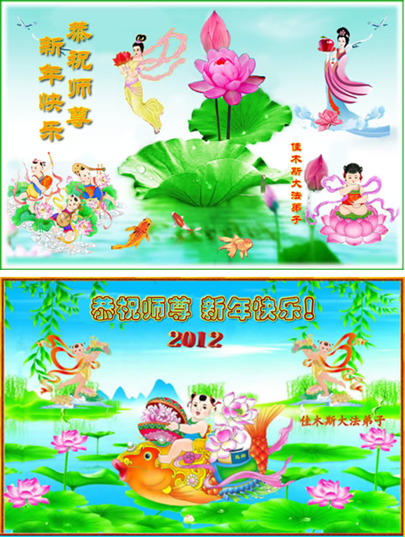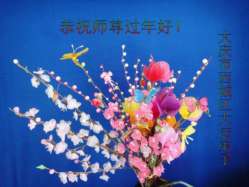 【明慧网二零一二年一月二十二日】从二零零一年开始,世界各地的大法弟子纷纷在中国新年之际,将发自内心的节日贺词、自制的贺卡、诗歌等寄给明慧网,向慈悲伟大的师尊李洪志先生恭祝新年快乐。这里收集的是壬辰年(二零一二年)新年东北三省大法弟子发来的146条贺词贺卡。 大庆市西城区大法弟子恭祝师尊过年好!