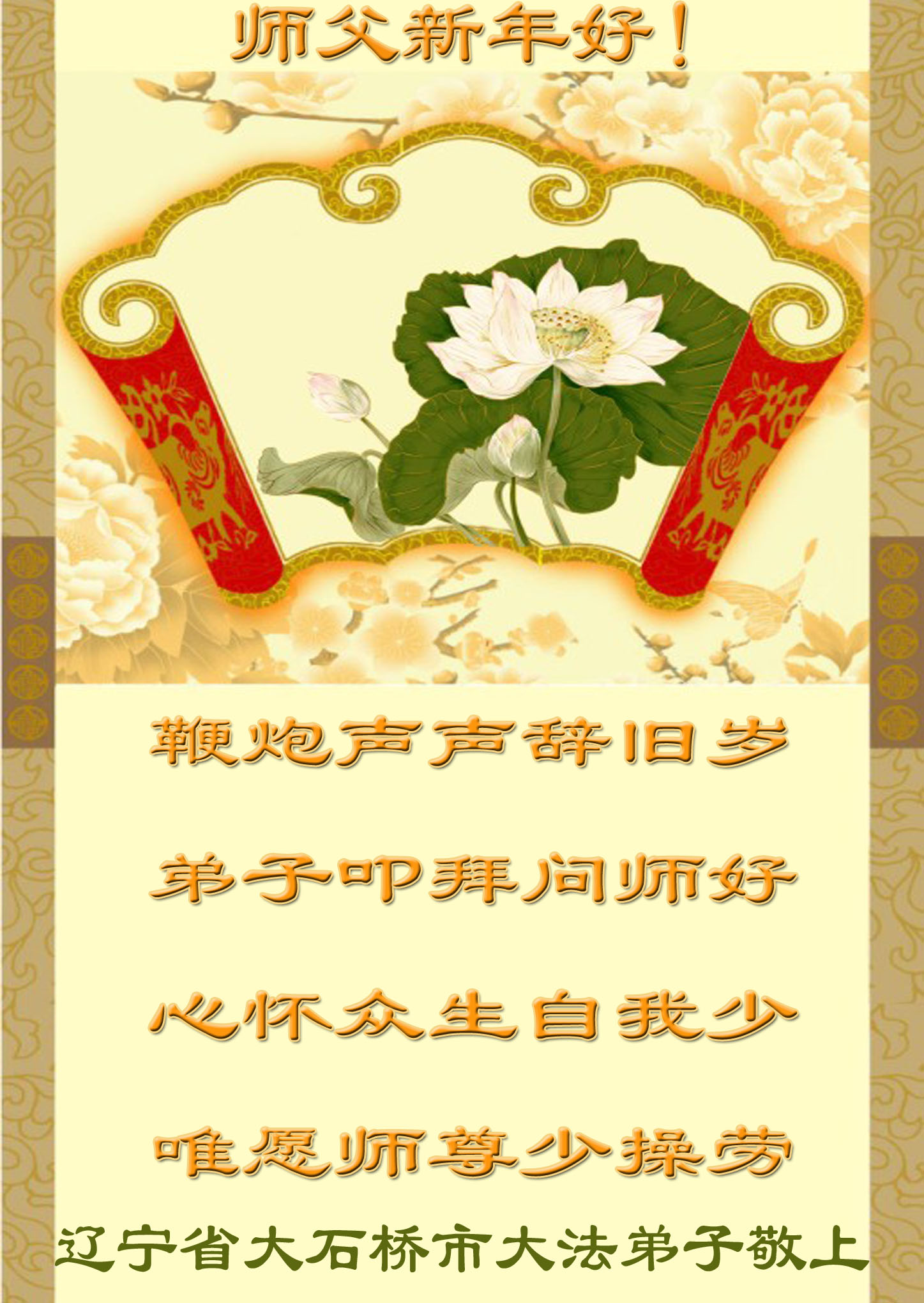 我们代表全家儿女给师尊拜年!师父辛苦了!您为救度众生承受了无数的巨难,我们一定不辜负师尊的慈悲苦度。在新的一年里,弟子要勇猛精進,努力做好三件事,跟上正法進程,在这最后的时间里,救度更多的众生,完成史前大愿。做一个合格的大法弟子。 辽宁省大石桥市大法弟子恭祝慈悲伟大的师尊新年快乐!