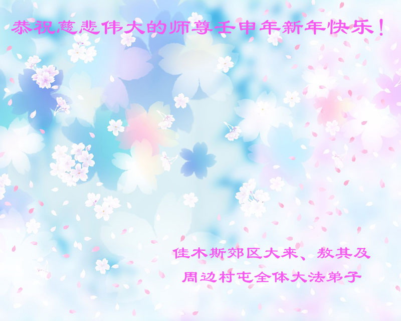 师恩洪大满苍宇,众生之福真善忍。 法莲盛开处处春,能得大法归正道。 法轮旋出新纪元,新天新地万象新。 佳木斯郊区大来、敖其及周边村屯全体大法弟子祝师父新年快乐!