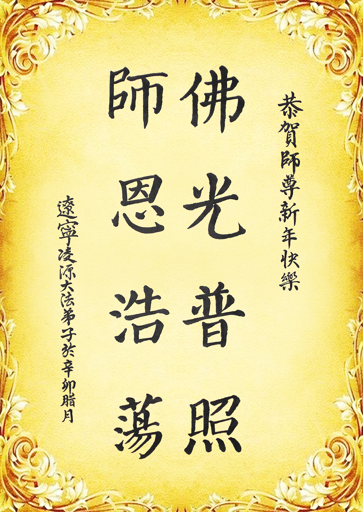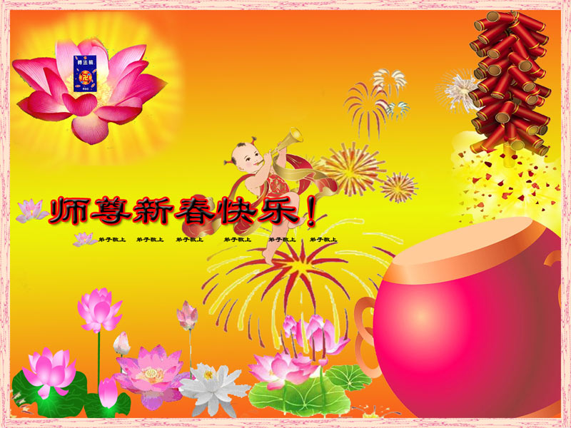 大法徒亿万数,真修炼师尊度。 经风雨金刚铸,徒精進志如初。 大法书认真读,救众生莲花吐。 正法路使命殊,不辜负师尊度。 过新年庆团圆,众弟子拜佛主。 九叩首谢师父,师快乐师幸福。 吉林省长春市大法弟子恭祝师尊新年快乐!