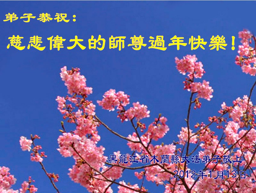 慈悲苦度恩浩荡 廿载正法历沧桑 栽得梅莲亿万朵 纪元新开慧十方 三:退.大潮连天涌 红朝丧钟已敲响 救得众生入新界 天国神现景辉煌 瑞雪飘飘思绪飞 万里遥遥远相望 想念师尊谢洪恩 弟子助师救人忙 遥祝师尊新年好 法轮转动沐佛光 待到雪融冰消日 丹心一片迎圣王 沈阳市法库县全体大法弟子 二零一二年一月十日 大庆地区大法弟子向慈悲苦度我们的伟大师父拜年!恭祝师父过年好!