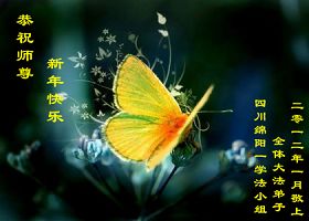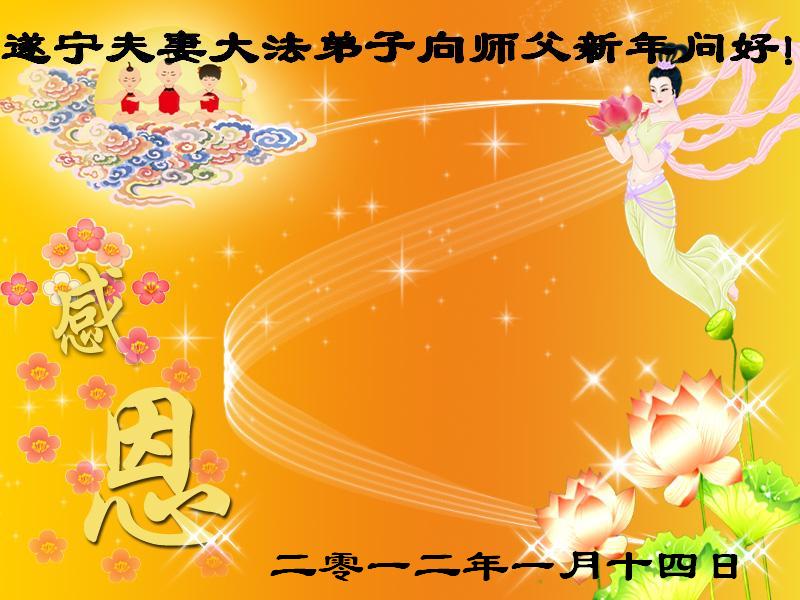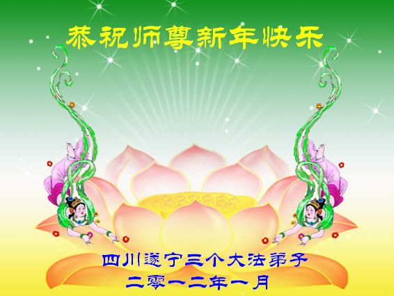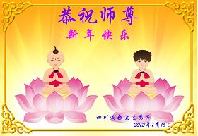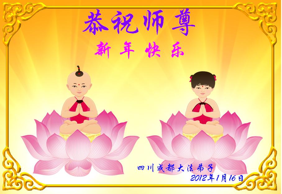 四川遂宁大法弟子恭祝师尊新年快乐! 五湖四海迎新春 新年佳节念师尊 遥祝师尊新年好 师恩浩荡宙宇新 主佛慈悲救苍生 法徒正念助师行 众生得救报师恩 弟子随师返天庭 四川遂宁大法弟子跪拜 二零一二年一月十六日 成都大法弟子恭祝伟大的师尊过年好