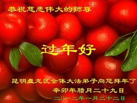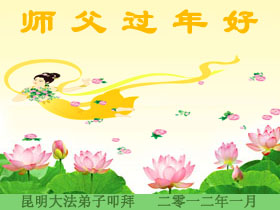 敬爱的师尊过年好!师尊辛苦了! 在您慈悲呵护下,我们又走过了一年。在新的一年里,我们一定遵照您慈悲的教诲:精進如初,做好三件事,救度更多的众生,兑现自己史前的誓约。请师父放心吧! 中国大陆成都市一学法小组全体弟子敬上 二零一二年一月十四日 云南省昆明市全体大法弟子向伟大慈悲的师尊拜年!恭祝师尊过年好!