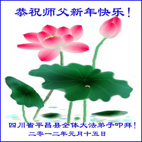 四川省平昌县全体大法弟子恭祝师父新年快乐! 精進 大法洪传二十载 救度众生不懈怠 学法入心正念足 勇猛精進众莲开 二零一二年元月十五日 重庆市大足区全体大法弟子恭祝伟大慈悲的师父过年好!