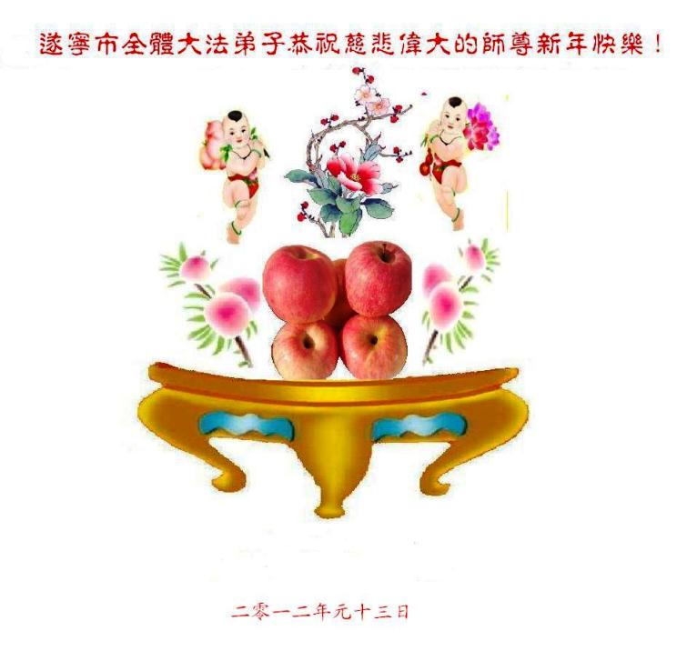 在此龙年到来之际,我们怀着无比思念之情,感谢师尊的救度之恩!多年来,在大陆邪恶迫害的严峻环境中,我们只有百分之百的信师信法,在师尊的慈悲呵护下,才能使我们在证实法中平稳的走到了今天。请师尊放心,我们会一如既往的学好法,多学法,向内找,修自己,发正念,讲真相,整体配合好,助师正法,多救众生,完成自己的史前大愿,圆满随师还。 四川遂宁地区全体大法弟子祝贺师尊新年好!