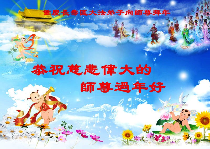 师尊:您好!是您把我们从苦难、病魔中拯救出来,使我们获得了新生。我们一定不辜负师尊的教诲,做好三件事,学好法,讲好真相,多救世人,兑现我们的史前大愿,跟师父回家! 大陆重庆北碚大法弟子恭祝慈悲伟大的师尊过年好!