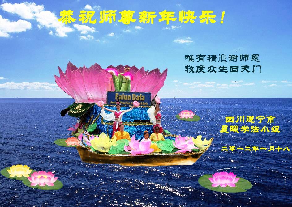 四川遂宁市全体大法弟子向慈悲伟大的师尊问好!感谢师尊慈悲苦度!恭祝师尊新年快乐! 我们一定走好最后的路,抓紧时间修好自己,多救众生,做一个师父所要的合格大法弟子,跟师父回家。 跪拜师尊!