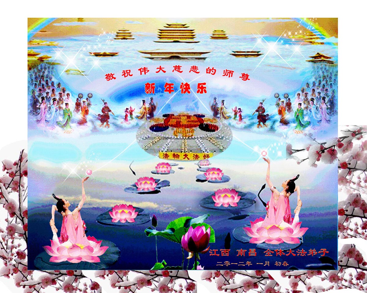【明慧网二零一二年一月二十三日】从二零零一年开始,世界各地的大法弟子纷纷在中国新年之际,将发自内心的节日贺词、自制的贺卡、诗歌等寄给明慧网,向慈悲无私的师尊李洪志先生恭祝新年快乐。这里收集的是壬辰年(二零一二年)新年华东地区大法弟子发来的贺词贺卡(162条)。 江西宜春大法弟子恭祝师尊新年好!