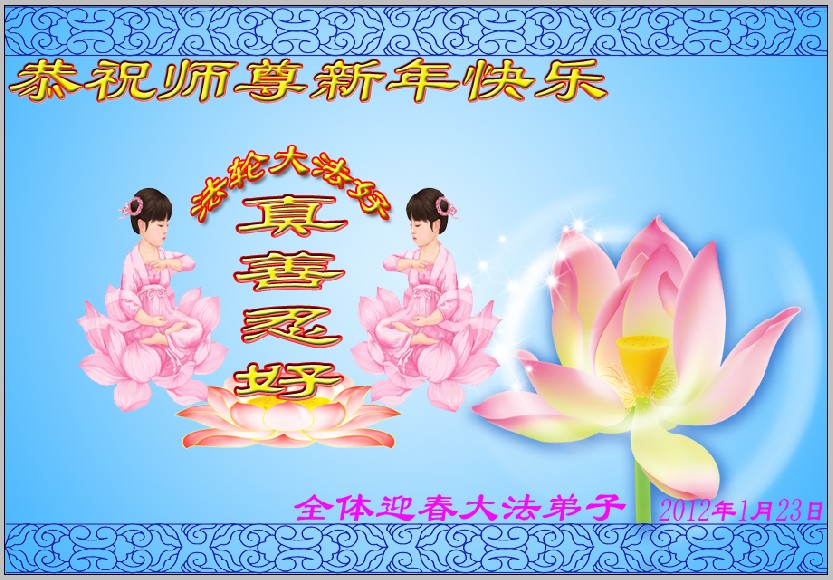 大陆大法弟子恭祝慈悲伟大的师父新年快乐! 在新的一年实修、真修,正念正行,解体邪恶,救度世人与众生 大法弟子 2012年1月14日 大陆大法弟子恭祝师尊新年愉快