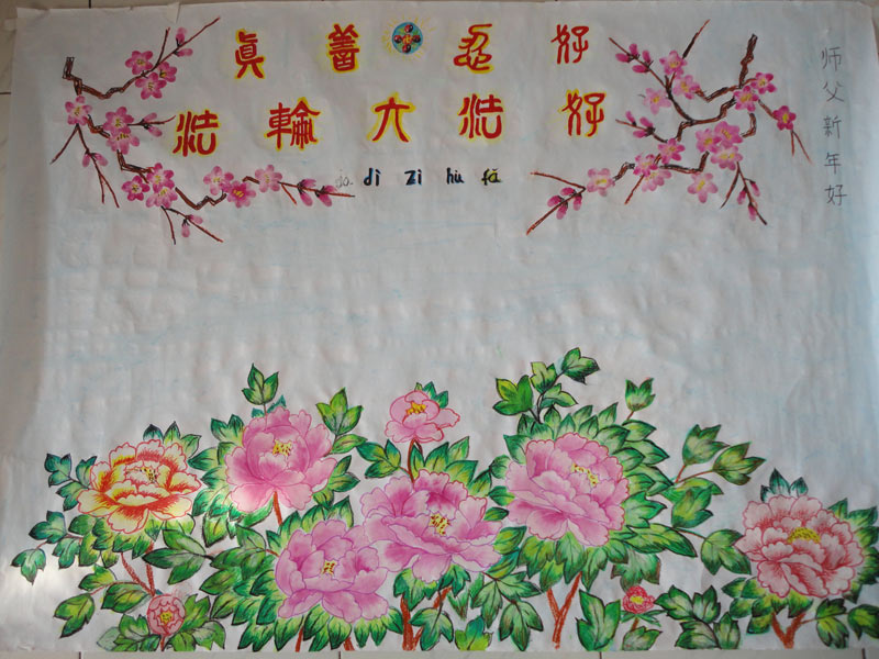 此画是弟子在非常想念师父的情况下而画的。画面的梅花比做大法弟子,一枝梅花是代表大法弟子的一个整体,也就是所有的大法弟子。梅花把“法轮大法好,真善忍好”围在了中间。意思是大法弟子在护法。牡丹花是富贵的意思。因过年了,只能用一张画的形式问一声师父过年好!以此来表达对师父的想念和感恩之情。 东北地区大法弟子祝师尊新年快乐!