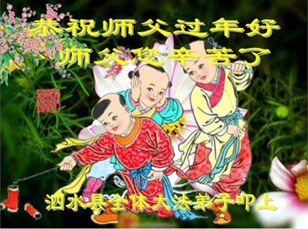 有师真好 师传天法 乾坤更新 法徒上亿 助师正法 史前大愿 随师兑现 精進实修 三件事中 证实大法 超常科学 救度众生 劫难走出 除尽祸殃 人心归正 未来大穹 美好无限 今生荣幸 大法徒当 有师真好 师给导航 教会做人 走出迷茫 内心深处 叩谢恩师 师父慈悲 将我选择 洗净旧尘 成就新宇 有师真好 永远骄傲 有师真好 无比幸福 泗水县全体大法弟子恭祝师父过年好!