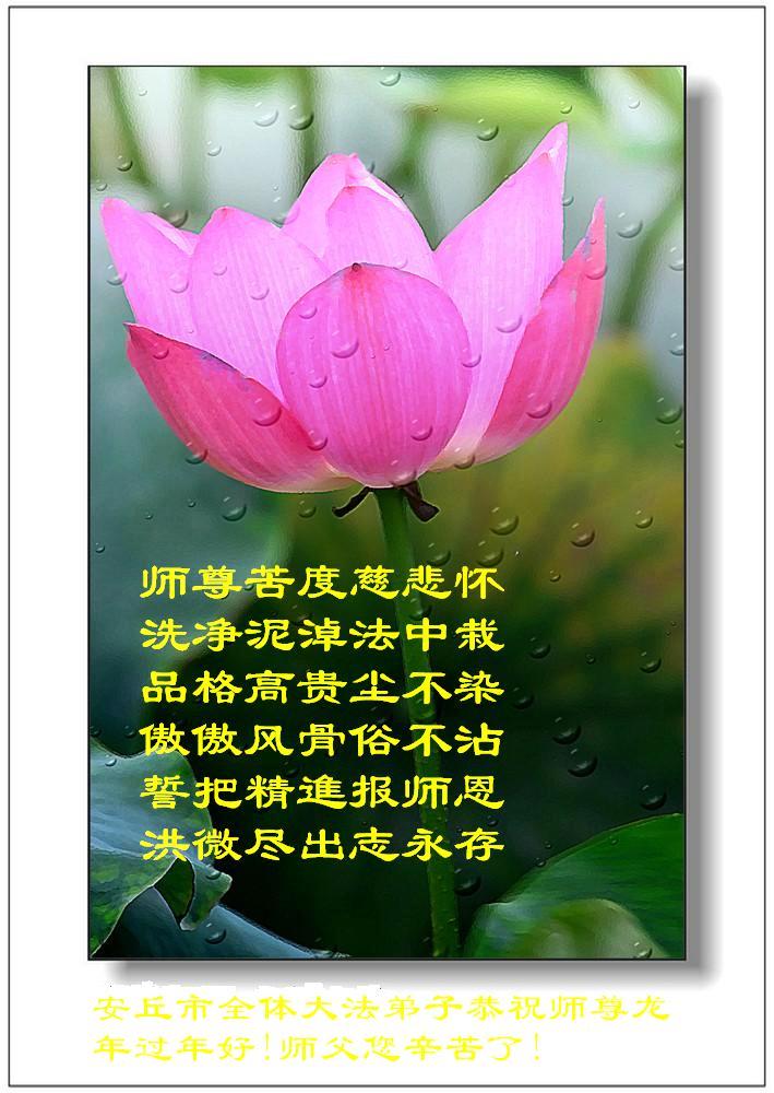 玉兔驾云去 神龙乘风来 年复一年飞飞快 时间怎容我慢怠 做好三件事不是空谈 千难万险脚下踩 信师信法要实修 正念正行驱鬼怪 世俗路上走神路 它日随师法船开 无极县全体大法弟子恭祝师尊新年快乐!