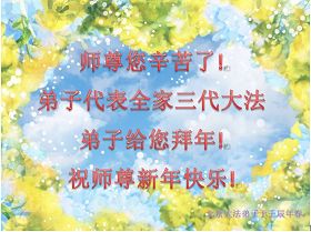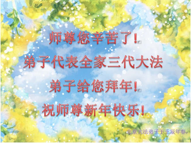 感谢师尊的慈悲苦度!在新的一年里,我们县全体大法弟子一定谨记师尊的教诲,学好法,修好自己,做好三件事。互相配合,助师正法,救度更多的众生。不忘自己的责任,实践生命的伟大意义,做一名合格的正法时期大法弟子! 北京大法弟子代表全家三代大法弟子给师尊拜年!