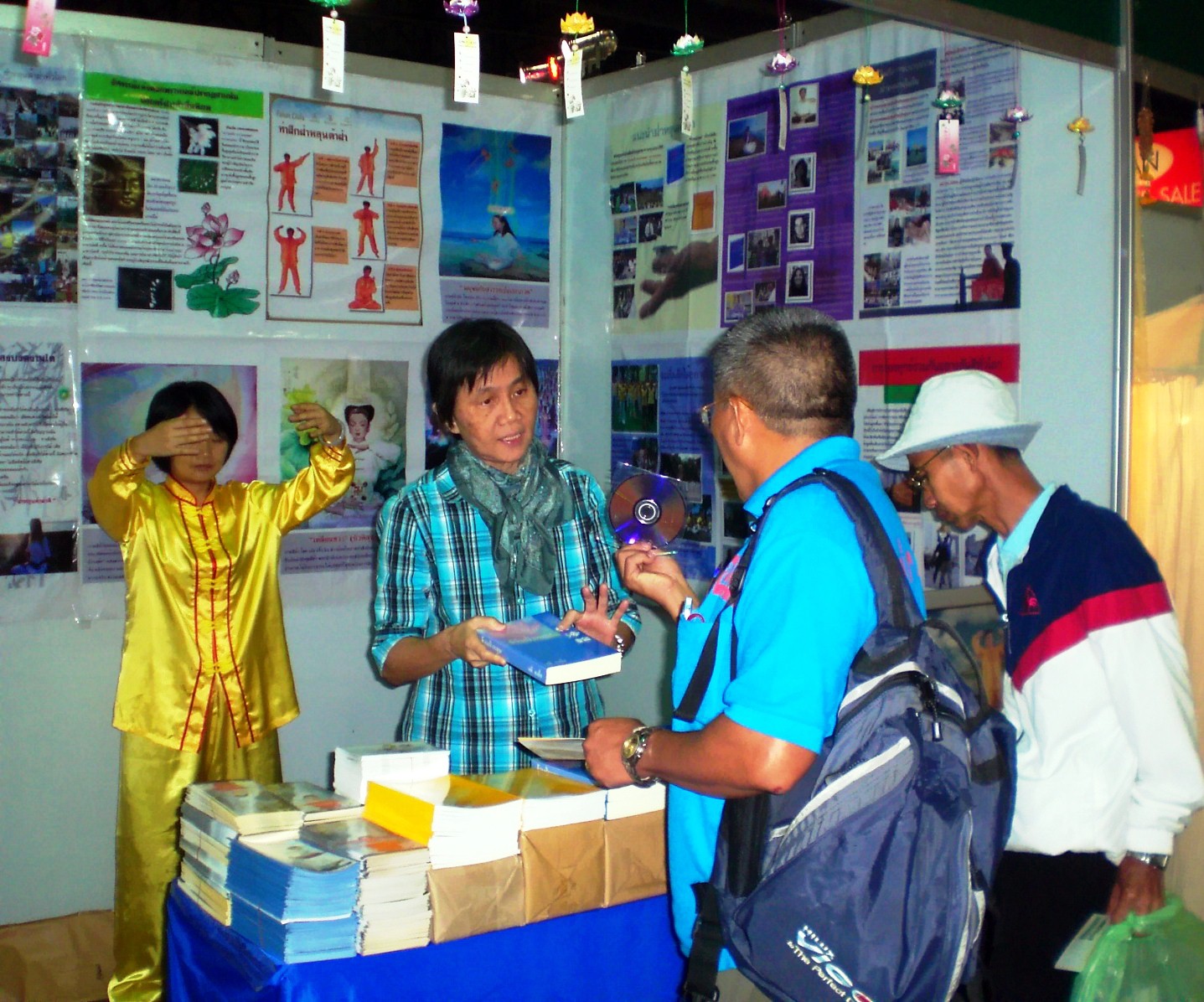 | 【明慧网二零一二年十月十五日】二零一二年十月六日至十四日,泰国时尚美食节在蒙通他尼府登场,美食节上游客众多,气氛热烈。为了传播法轮大法的美好,法轮功学员也参加了这一活动。 为期九天的集会在Impact展览中心举行,大厅里排满了琳琅满目的各种展位,从上午到傍晚,人群络绎不绝。法轮功展位悬挂着大法洪传及法轮功被迫害真相图片,摆放着法轮大法书籍、真相资料、光盘等,并用美丽的莲花书签装饰着展位,吸引了不少民众驻足观看,有的人在听完了学员的介绍之后,购买了大法书,表示想学炼法轮功。  民众在法轮功展位前驻足了解真相 |