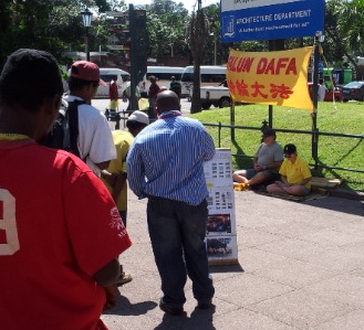 【明慧网二零一二年三月二十三日】二零一二年三月二十一日是南非“人权日”,当地的许多团体都举行各种活动,呼吁人们关注人权。二十一日上午,法轮功学员在德班市政厅前广场上集体炼功,向路过的行人介绍法轮功,同时揭露中共长达十二年多来迫害法轮功的真相。 南非德班市政厅前广场上,人们阅读法轮功真相展板 |