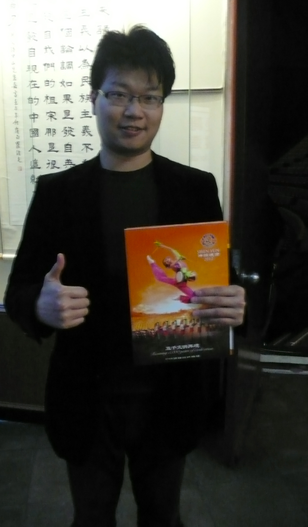 总统马英九、副总统萧万长、立法院院长王金平、行政院副院长江宜桦、行政院文化建设委员会副主任张云程、台北市议员林瑞图、新北市议员王淑惠,艺人余天、知名老牌演员马如龙等政商名人在神韵台北场开演前特别致赠花篮到国父纪念馆,祝贺神韵演出圆满成功。行政院大陆委员会主任委员赖幸媛也赠送“神韵天成、艺臻化境”的贺词。 小提琴家:神韵艺术价值非常高 观看二十三日晚的演出后,普罗艺术家乐团首席、世纪交响乐团首席、广艺爱乐管弦乐团首席小提琴演奏家蔡耿铭看完神韵演出后难掩心中的感动,他赞赏神韵非常具有艺术价值,对于中西合璧的乐团的原创音乐与演奏非常赞赏,他说,“像一些动作会搭配一些音乐的高潮,如(恶警)打人的动作,就会配合打击乐,当舞蹈演员跳跃的时候,弦乐会比较多、比较轻快,在《练武场》这个节目中,小号就比较多。”  普罗艺术家乐团首席、世纪交响乐团首席、广艺爱乐管弦乐团首席小提琴家,现任职国立台北教育大学与国立台湾艺术大学蔡耿铭 |