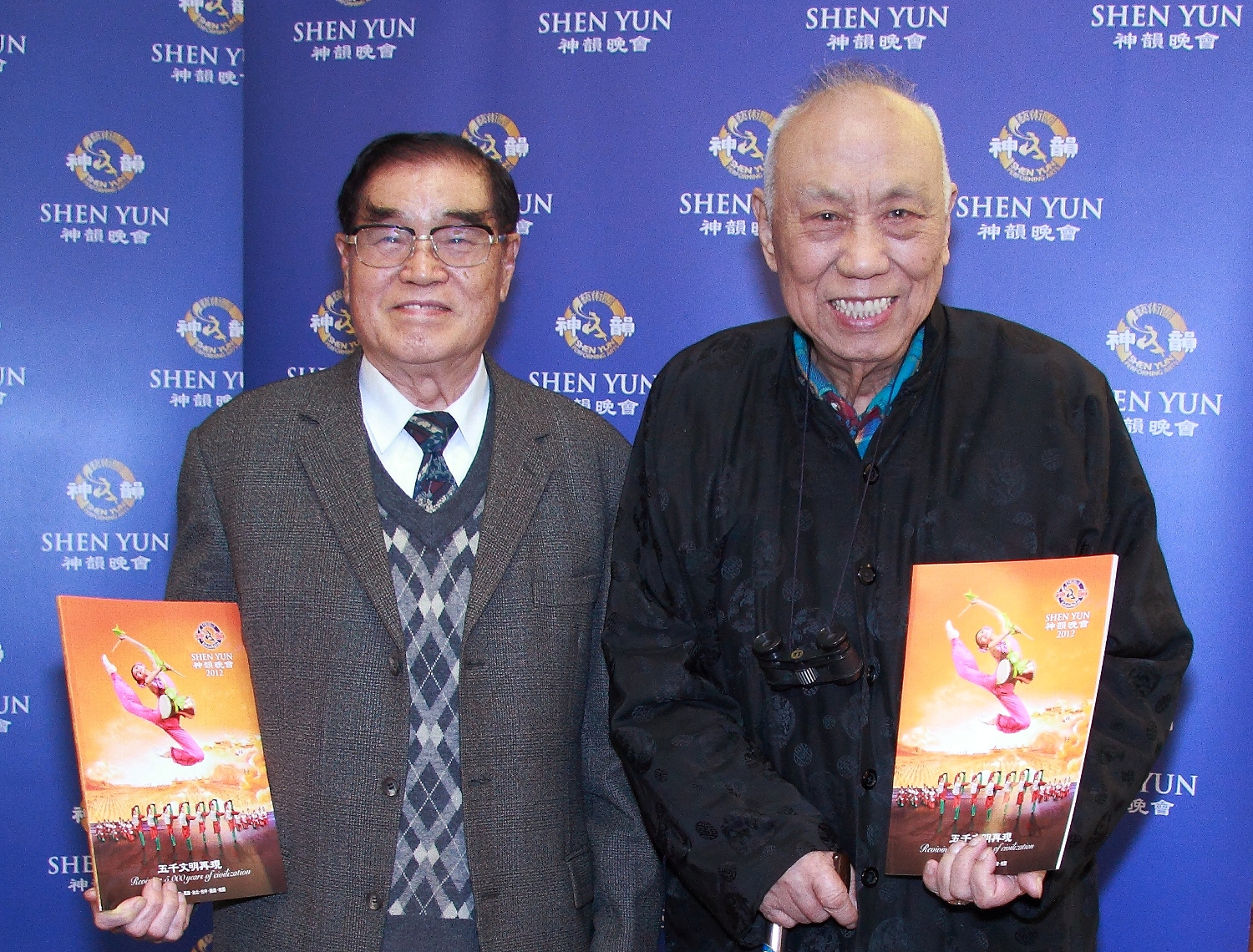 新加坡佛教学会秘书长柯志伟,担任佛教学会的主持,专程从新加坡搭机来台观赏神韵纽约艺术团三月二十二晚在台北国父纪念馆的演出,柯志伟赞赏:“中华文化很有价值。我觉得神韵舞蹈演员的基本功都非常扎实,舞姿非常漂亮。演出中所传递的信息简单明了,原创的音乐也非常动听,深受启发。” 柯志伟强调:“我非常尊崇中华文化。当然,我真的非常喜爱中国的传统。她蕴藏着五千年古老智慧的结晶。比如(《快乐的小和尚》)他认为在尊重传统文化的前提下加入一点幽默感是很好的,这对现今的社会来说是很好;更可以让年轻的新世代在现代与传统价值中找到平衡点,以至于不会远离(正统)中华文化。” 柯志伟表示:“(神韵)提醒了我更深入的思考我们是谁,也提醒我们要为后代子孙保存我们现在所拥有的(传统美好的文化)。一定会将神韵精湛的演出与美好带回新加坡,广为告知并分享给亲友。” 九旬退役上校赞神韵演出完美、太难了 高龄八十九的退役上校杨琅,三月二十日晚上,在朋友的邀请下,第一次观赏神韵的演出,杨琅是陆军黄埔军校二十期的退役军人,平时喜欢欣赏京剧及艺术表演,年轻时也粉墨登场,常扮演老生的角色。  浙江省旅台同乡会县市主任委员、退役陆军中将高海翔(左)、退役上校杨琅 |
