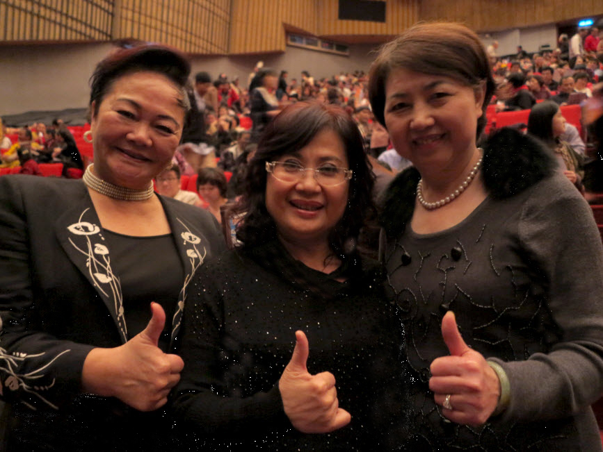 杨琅在看完整场的神韵演出后,拄着拐杖,神采奕奕,声如洪钟一般的分享着自己的激动心情,对于神韵节目的精湛及演员的表现,频频称赞要做到如此的境界实在“太不容易”、“太难了”、“很感人”。 舞蹈演出中有着中国古典舞中的水袖、扇子舞等等,令杨琅感到亲切,其中,杨先生对于整场的舞蹈的表演水平赞不绝口。他表示无论是个人、还是团体的舞蹈,在翻腾技巧、整体动作的整齐、或编舞的排列组合,都相当杰出,他连声称道“赞”五次,并且说演出实在“太好了”。 谈到舞台上的演出和舞台下音乐的搭配上,杨先生表示相当完美,并称道要达到这样的境界“多难”,那是需要多少人力、以及幕后指导等等的投入,才能呈现。 还有服装色彩的搭配,杨先生表示“简直没话讲”、“值得赞扬”,他语气激动的说:这么优秀的演出是很不容易的,真是值回票价,看完后的心情相当满意,除了表示还想再看,也希望神韵演出能多多弘扬。 台北菁英狮子会:美的令人震撼  (左起)狮子会驻区总监、财星国际股份有限公司董事长赖惠燕、狮子会驻区总监、财星国际股份有限公司董事长黄秀榕、狮子会 300-A2区公关长、台北市工商妇女会理事长张淑华 |