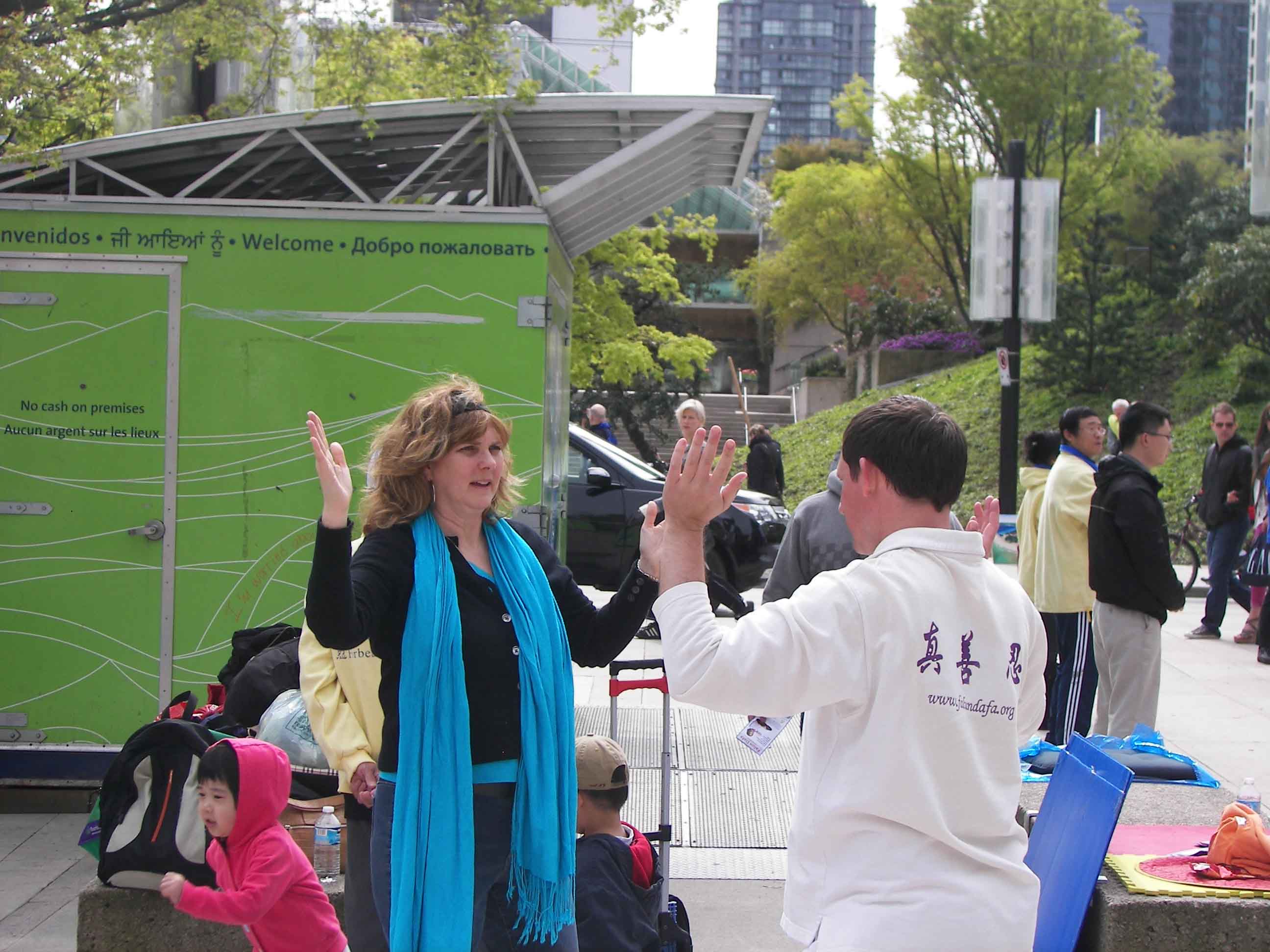 听完学员介绍,路人现场就开始学炼法轮功 |