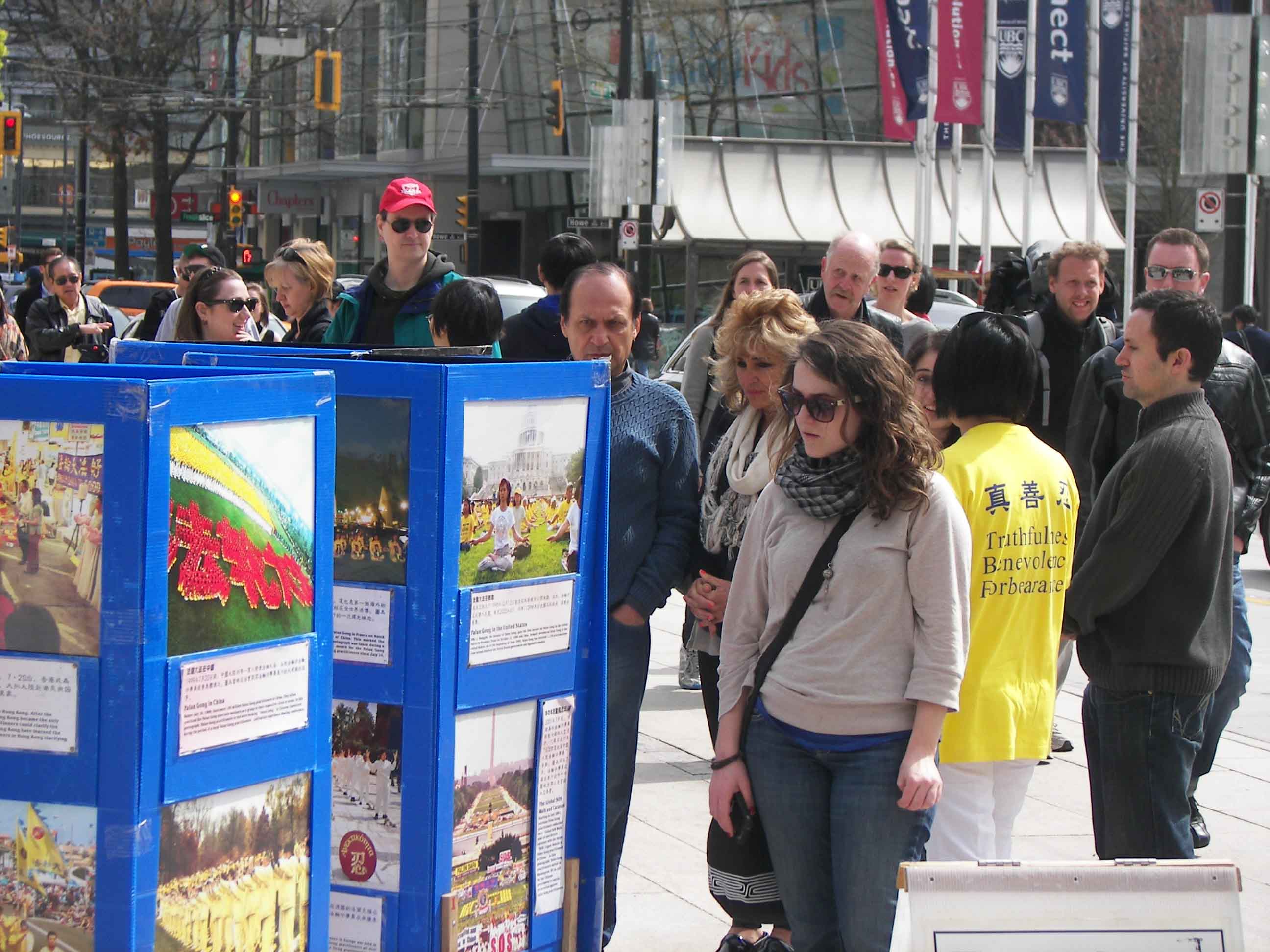 四月二十一日,温哥华风和日丽,市中心熙熙攘攘,行人和游客不断,法轮功学员在市中心艺术馆前的炼功场面和图片展,吸引了很多过往的行人。不少人停留下来观看图片,并询问法轮功真相。还有很多行人将法轮功学员的炼功场面拍摄下来。 很多民众在现场了解法轮功功法和反迫害真相,如有人询问她有腿病,是否也可以炼功,还有人在听完学员介绍后,现场就开始学炼动功等等。从瑞典来温哥华旅游的儒那•司若(Jules Snow) 先生和莉沙•斯伯(Lisa Sburger) 女士将法轮功学员集会炼功场面用照相机拍照留念。儒那•司若先生表示,他在两年前就了解到了中共迫害法轮功的事实,他对此感到愤怒,他为法轮功学员祝福。莉沙•斯伯女士用不熟练的英语反复讲了两遍“停止迫害法轮功”。 有不少华裔留学生、大陆观光客和大陆新移民,在艺术馆前停留,观看真相图片和炼功场面。一对从中国大陆来温哥华旅游的中年大陆游客,长时间仔细观看真相图片,并询问了很多细节。 大陆新移民王先生来加拿大两年,张女士来加拿大三年,他们在展台前停留很长时间,详细询问如何能收到刚刚在温哥华落地的新!唐!人:电视节目和哪里有法轮功炼功点。王先生表示,看到有这么多法轮功学员在炼功,很吃惊,而且学员中从几岁的孩子到年龄大的老人都有,说明法轮功很有效。他特意询问了附近哪里有教功的炼功点,表示他会找时间去。张女士表示,她在中国大陆无法看到这样的炼功场面,听到的都是对大法的诽谤,所以她特别想要了解事实真相,她反复讲希望自己找寻法轮大法真相,所以她今天在活动场地驻留了很长时间了解更多详情。