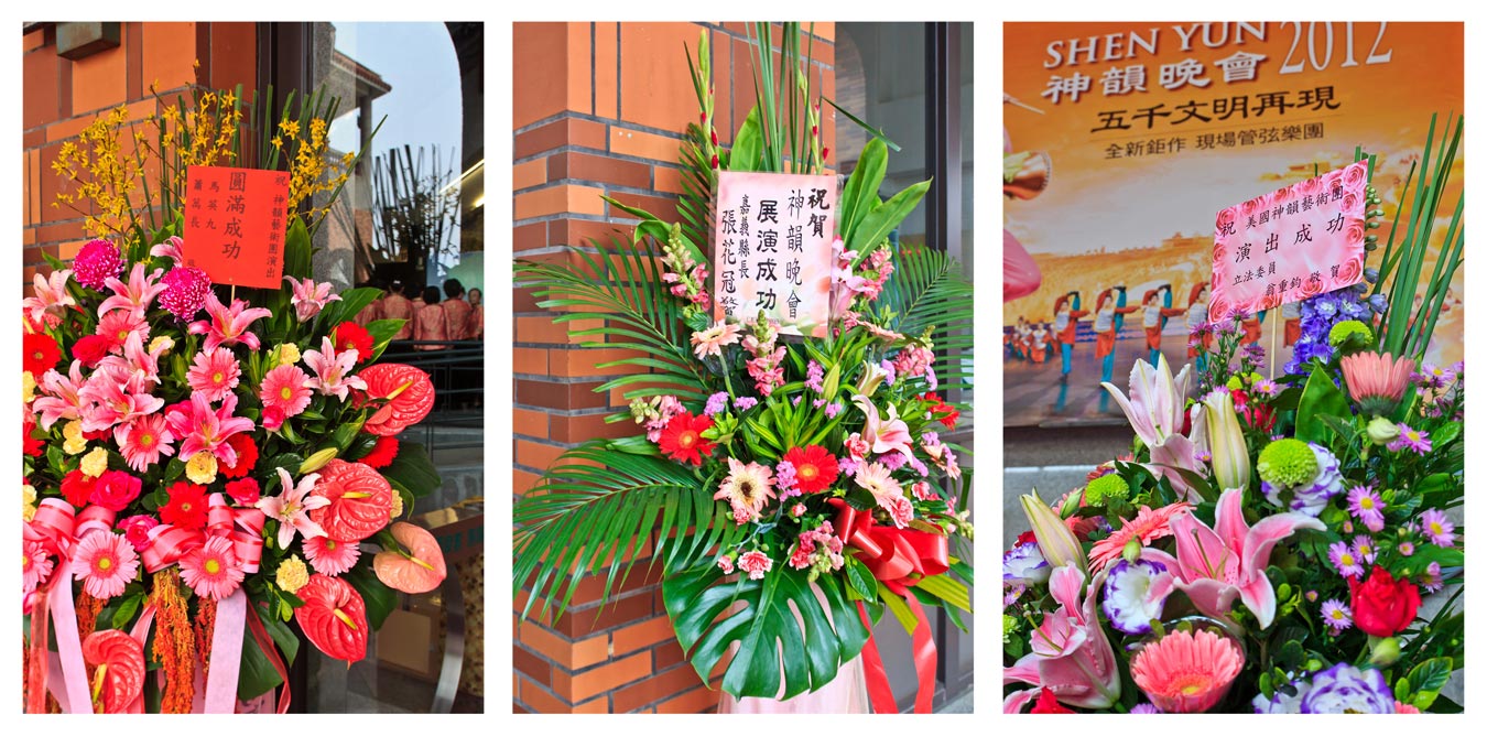 | 【明慧网二零一二年四月八日】(明慧记者王清汉嘉义报导)美国神韵纽约艺术团在嘉义县民雄演艺厅二零一二年四月三日、四日的三场演出,受到嘉南平原民众的热烈欢迎,连续三场在一票难求的盛况中圆满落幕,约有二千七百名观众入场体验“世界第一秀”带来的全新震撼。 “神韵热”持续在两岸三地发烧,今年剧场出现了特殊景象,许多大陆人士专程来到嘉义观赏神韵晚会。大陆观众被神韵展现的正统中华文化节目内容深深打动,不少人在走出剧院时眼眶仍泛着泪水表示:“希望神韵尽快到中国大陆演出。”  总统马英九、副总统萧万长;嘉义县长张花冠;立委翁重钧等致赠花篮,祝贺美国神韵纽约艺术团演出成功。 |