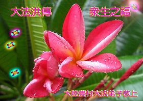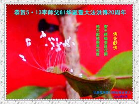 我们一定听师尊的话,坚如磐石做好自己该做的三件事,请师尊放心。 向师尊报个喜信:我们两个资料点大部份弟子家一直都盛开着婆罗花,我的孩子不修炼但她和她的孩子为大法做了很多该做的事也选择了美好未来,她的家也一直盛开着婆罗花。 85岁老同修满头黑发,几進几出,早上抓、中午放,照讲不误,一星期三:退.一、二百人。 再次谢谢师尊对我们全体大法弟子和我不修炼的孩子的鼓励。 我们全体大法弟子和我不修炼的孩子向伟大的师尊叩首。 二零一二年五月七日 河北省廊坊永清县农村大法弟子恭祝师尊生日快乐!