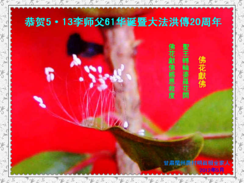 祝贺师尊洪传法轮大法二十周年,在此世界法轮大法日之际敬祝慈悲伟大的师父生日快乐!弟子们要更加精進做好三件事,不辜负师父的慈悲苦度。 河北省霸州市农村大法弟子一家七口人恭祝 二零一二年五月九日 河北省廊坊市霸州市农村大法弟子一家三口人恭祝师尊洪传大法二十周年,敬祝师父生日快乐!