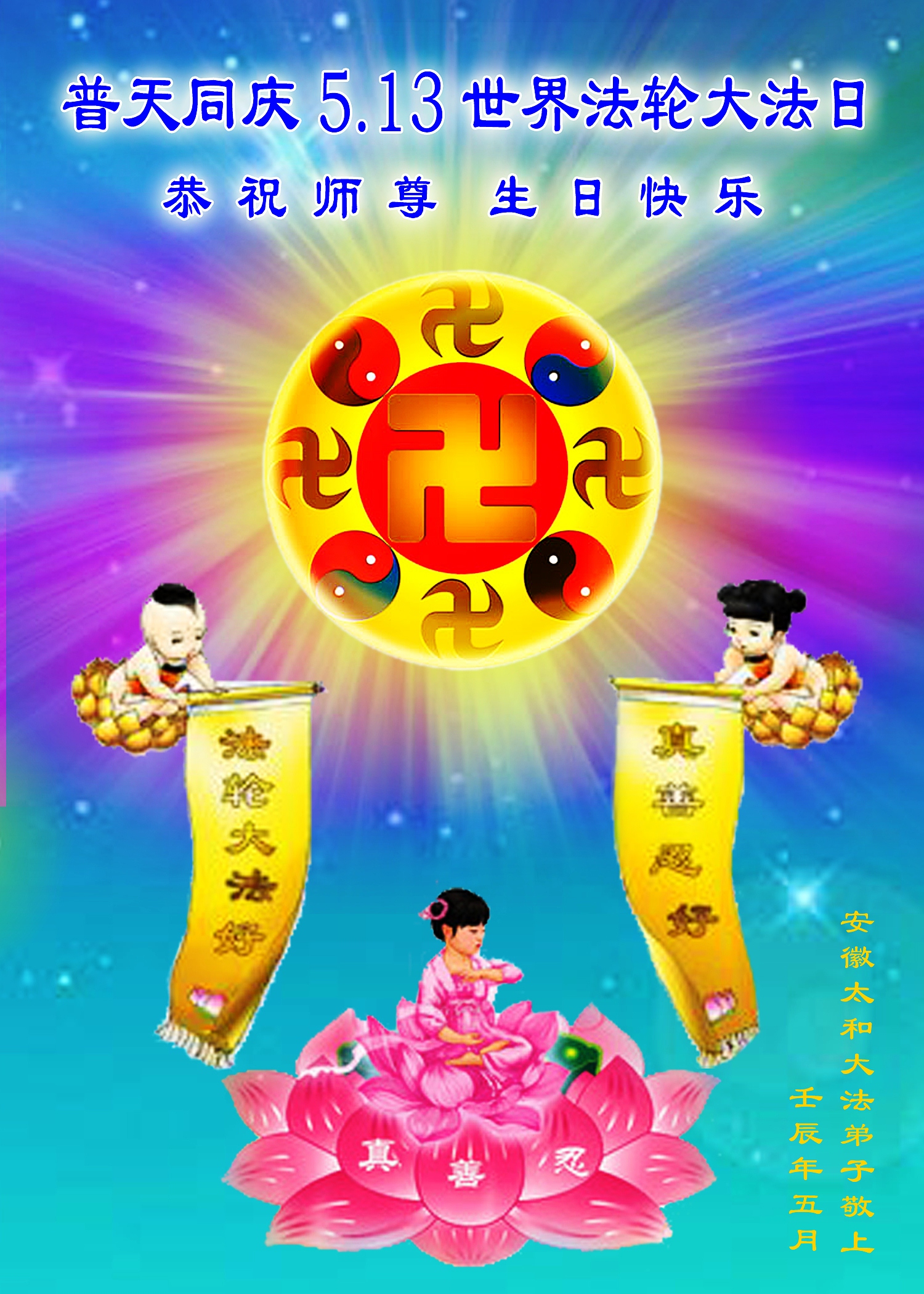 五月十三转法轮, 大法洪传二十春; 恭祝师尊华诞日, 普天同庆主佛恩。 佛光普照新苍宇, 唤醒众生传神韵; 学法修心发正念, 救度迷中有缘人! 安徽合肥众大法弟子恭祝慈悲伟大的师尊生日快乐!庆贺大法洪传20周年!庆贺世界法轮大法日!