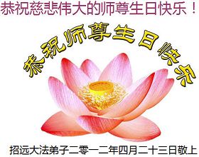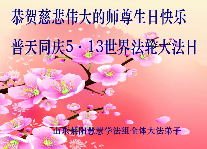 在这欢庆的日子里,我们一定牢记师父的教导学好法,做好三件事,在正法的最后阶段走好每一步,跟师父圆满回家。 山东省烟台市招远市大法弟子恭祝师尊生日快乐暨世界法轮大法日!