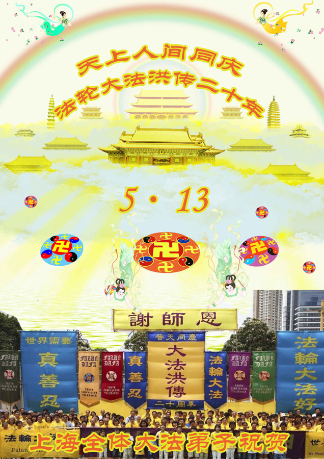 上海大法弟子恭祝慈悲伟大的师尊生日快乐!恭贺法轮大法洪传二十周年!普天同庆5.13世界法轮大法日!
