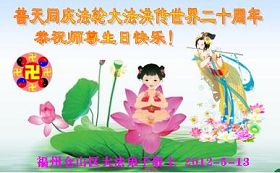 向慈悲伟大的师尊致以最崇高的敬意!我们要抓紧时间做好三件事,走好最后的路,完成我们的史前大愿。 福建省福州大法弟子普天同庆法轮大法洪传二十周年!恭祝师尊生日快乐!