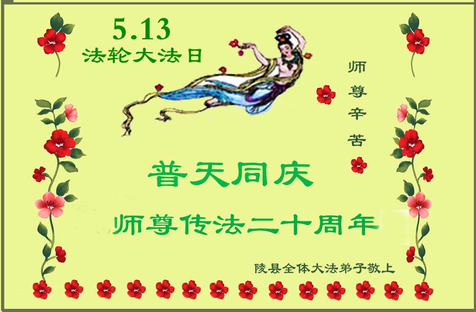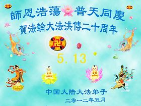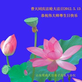 山东省潍坊一流离失所的大法弟子代表全家及亲属庆祝法轮大法洪传二十周年!庆祝“513”法轮大法日!恭祝伟大慈悲的师尊生日快乐!