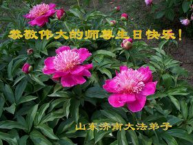 师父正法已有二十年了,我们在师父的引领下也走过了十几个年头。在这期间所经历的一切无以言表,只感到师父为我们做的太多,而我们做的离正法的要求还差的很远、很远。在师父正法進程不断向前推進的今天我们深感救人的责任重大,今后我们一定要学好法,修好自己,互相包容,牢记向内找,圆容我们的修炼环境,牢记使命和责任,为一方众生得救负责。 山东德州市平原县大法弟子一家敬祝伟大的师尊生日快乐!