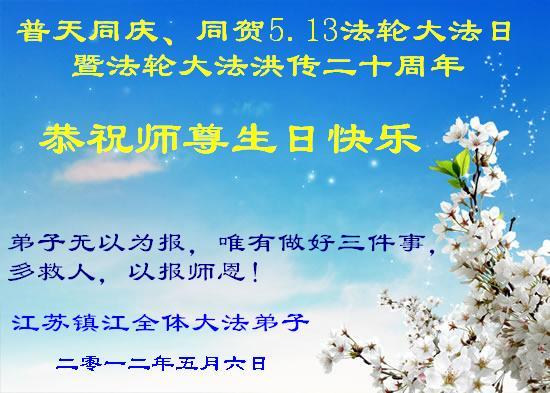 江苏镇江全体大法弟子普天同庆世界法轮大法日暨法轮大法洪传二十周年!恭祝师尊生日快乐!