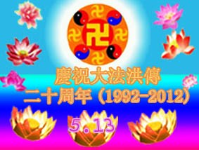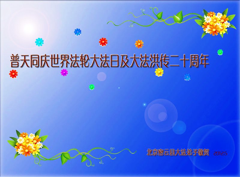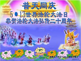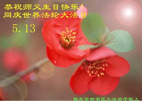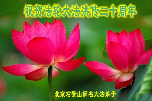 法轮大法洪传世间二十周年,在普天同庆“世界法轮大法日”的日子里,我们更要恭祝慈悲的师父生日快乐!跟随师父的正法進程走过了十三年,怀安县的大法弟子开始成熟起来,逐渐从人的观念走向神念,体悟到了修炼的内涵;在整体配合中以法为师,放下自我、互相包容。在今后的证实法修炼中,我们每个弟子唯有实修自己,走正师父安排的路,助师正法、救度众生,才是感恩师父的慈悲救度! 再一次恭祝师父生日快乐! 北京石景山两名大法弟子恭贺法轮大法洪传二十周年!