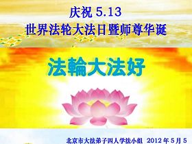 弟子一定坚定实修,做好三件事。 北京市丰台区马家堡法轮大法弟子 2012年5月7日 北京朝阳区大法弟子恭贺师尊华诞!恭贺世界法轮大法日!