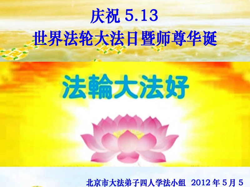 师尊啊师尊:弟子们有幸得到您与大法的救度与恩赐,又能当上正法时期的大法弟子无上荣耀、无比珍贵。弟子们决心认真修自己,做好三件事,多救人、兑现誓约,助师正法,圆满随师还。 北京大法弟子四人学法小组祝贺5.13世界法轮大法日!