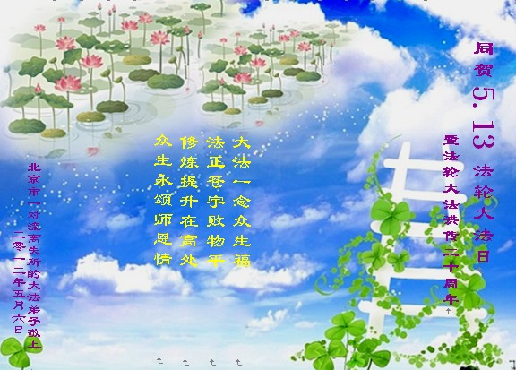 大法一念众生福 法正苍宇败物平 修炼提升在高处 众生永颂师恩情 北京市一对流离失所的大法弟子敬上 二零一二年五月六日 河北省石家庄大法弟子庆祝513法轮大法日,祝伟大的师尊生日快乐!