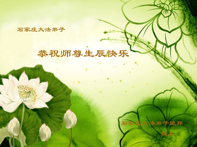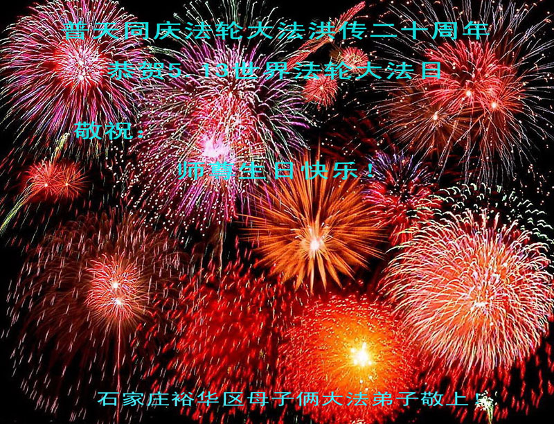 在普天同庆、全世界大法弟子同贺慈悲伟大的师尊寿辰和世界法轮大法日美好时刻,献 上天津大法弟子的祝福! 谨以此卡恭祝慈悲伟大的师尊寿辰,恭祝世界法轮大法日。 同时借此机会向全世界大法弟子问好!祝全世界大法弟子都勇猛精進,圆满随师还! 全体天津大法弟子敬上! 河北省石家庄杜北小区大法弟子恭祝师尊生日快乐!祝贺世界法轮大法日!