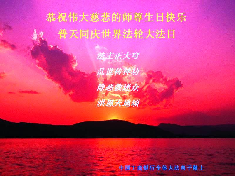 2012年5月13日是世界法轮大法日,慈悲伟大的师尊已在世间传法二十周年,大法弟子助师正法、反迫害救度众生已進行了十四年了。大法弟子在反迫害救众生中,已经越来越走向成熟了。大法已洪传世界一百多国家,造福全人类及宇宙苍生。中共邪*党-迫害佛法已彻底失败了,天要灭中共邪*党-,法正人间在即。在这最后最后的时间里,我们要抓紧最后的时间,紧跟正法進程,修去一切人心,整体配合整体提高,尽可能修好自己,兑现誓约,多救人,做合格的大法弟子,不负师尊的慈悲苦度! 中国工商银行全体大法弟子恭祝伟大慈悲的师尊生日快乐!庆世界法轮大法日!