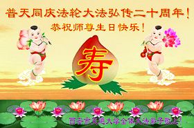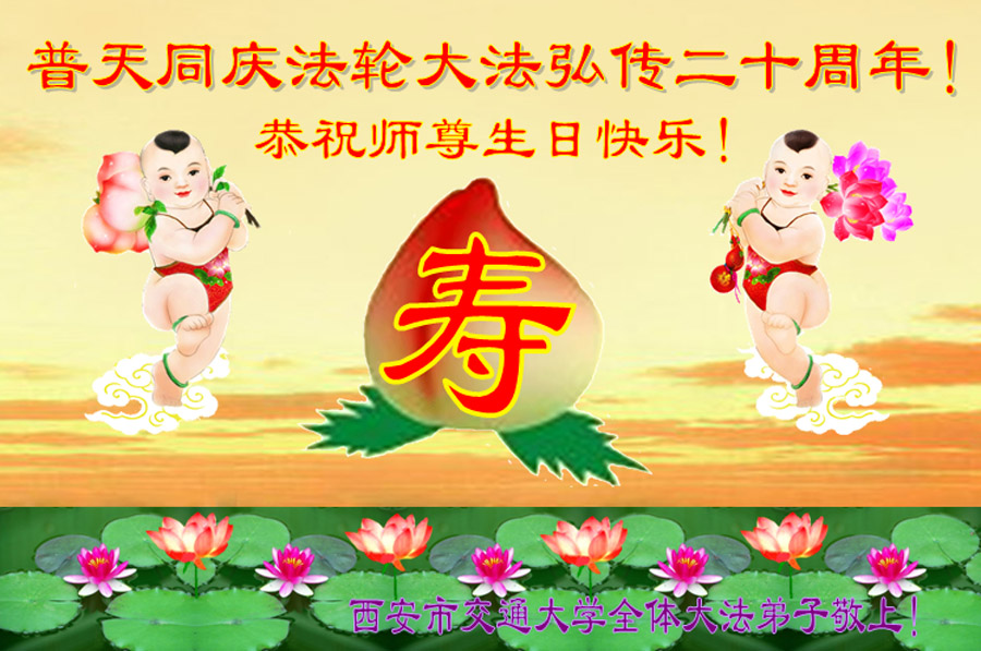 普天同庆同贺同祝法轮大法洪传二十周年! 陕西省西安市交通大学全体大法弟子敬上! 上海交通大学大法弟子叩拜师尊,恭祝慈悲、伟大的师尊生日快乐!