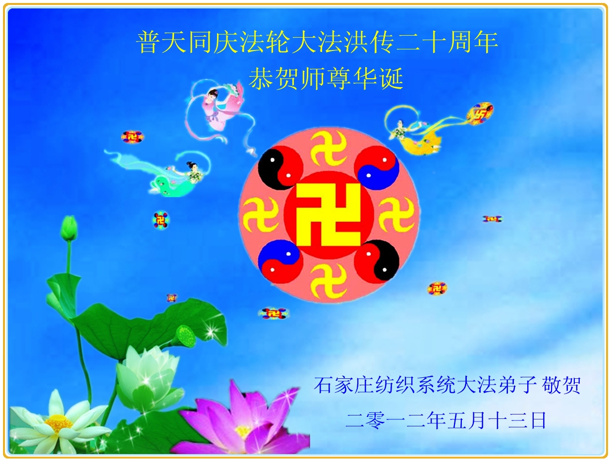 石家庄纺织系统大法弟子祝贺5.13世界法轮大法日!恭祝伟大的师尊生日快乐! 胜利油田大法弟子一家恭祝慈悲伟大的师尊生日快乐!