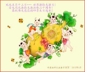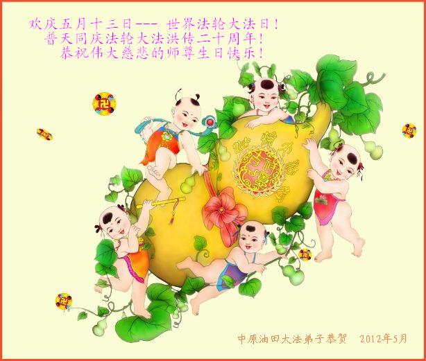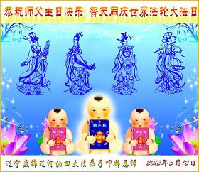 在师父生日和世界法轮大法日到来之际,弟子感恩师尊慈悲苦度,师父您辛苦了!弟子一定要做好三件事,精進实修,灭尽邪恶,救度更多世人,圆满随师还! 2012-5-7 胜利油田大法弟子恭祝师尊生日快乐!恭贺世界法轮大法日!