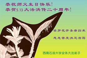 西南石油大学全体大法弟子恭祝师父生日快乐!恭贺大法洪传二十周年!