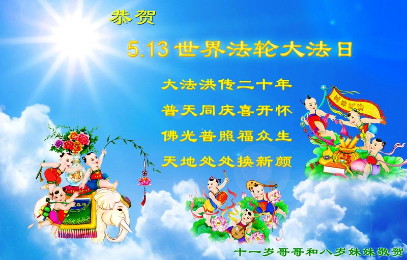 师父您好!小弟子们遥拜师尊生日快乐! 大法小弟子11岁哥哥和8岁妹妹恭贺5.13世界法轮大法日!
