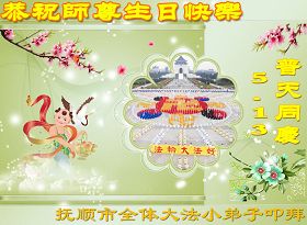 【明慧网二零一二年五月十二日】二十年前的五月,李洪志师父在中国长春将法轮大法公开传出于世,二十年后的今天,法轮大法洪传全球,亿万修炼者在大法“真善忍”的指导下道德升华,获得身心健康。大法小弟子们也纷纷通过明慧网表达他们对李洪志师父的感恩并恭贺李洪志师父华诞。 辽宁省抚顺全体大法小弟子恭祝师尊生日快乐!