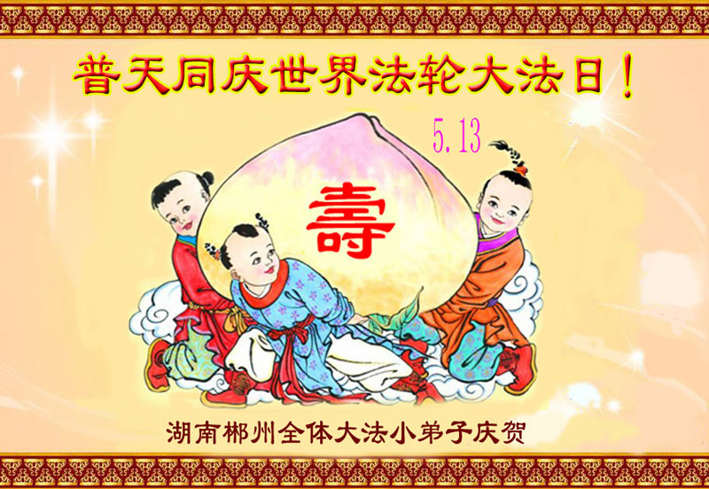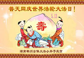 在这普天同庆的世界法轮大法日及师父的生日之际,我仅代表我和我的儿子大法小弟子向最伟大的师父祝贺生日!恭祝师父生日快乐!谢谢您为弟子及小弟子所做的一切,无法用语言形容,唯有多学法做好三件事,跪下合十! 2012年5月7日吉林市大法弟子及大法小弟子拜上 湖南郴州全体大法小弟子欢庆世界法轮大法日!庆贺法轮大法洪传二十周年!